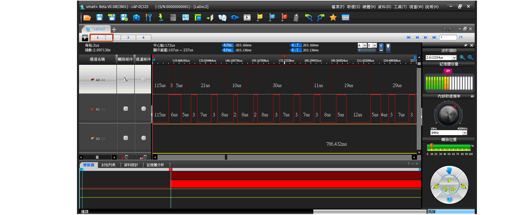 依照快速安装手册第三章所述,进行逻辑分析仪设定,设定完成后启动逻辑分析仪软件及送出待测物讯号进行撷取,撷取完成如图所示。