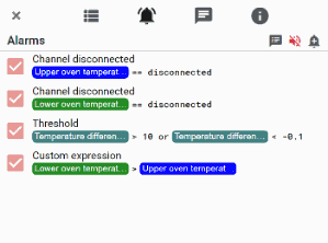 也许您正在测量培养箱中微生物培养物的温度,或者在大风中测量混凝土桥上的压力;当读数超出可接受的公差时,您需要得到通知。在 PicoLog 6 中,您可以设置警报以在参数超出范围时提醒用户。这可以配置为播放声音、在屏幕上显示视觉警报、运行的应用程序(例如电子邮件或 SMS 客户端),并自动注释捕获图以标记警报发生的时间和持续时间。
