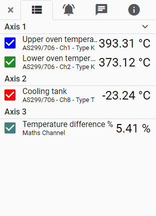 对于每个通道的测量单位不同的多通道记录应用程序,或者当通道测量范围两端的值时,添加额外的图形轴也是的。例如,同时测量超过 1000 °C 的炉内温度和环境温度需要两个轴,以便两者的细节可见。您一次最多可以查看四个具有不同范围的轴。