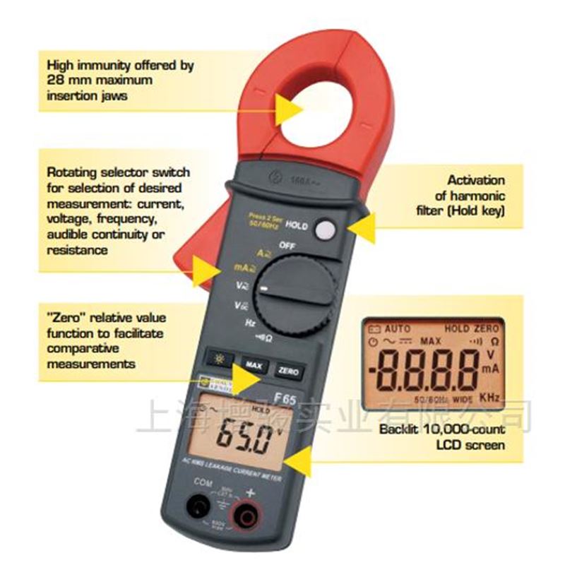 真有效值泄漏电流测量万用钳表是专门用于测量接地线的泄漏电流,您可以选择60mA或是600mA 档量程进行测量。特殊的钳形结构以及抗干扰设计让测试探棒可达到更高的灵敏度(10µA 以及 100µA)。在测试小电流时,隔绝外界噪音也是相当重要的,它能让您的测量更准确可靠。F65 万用钳表可以测量100A RMS、AC/DC电压、电阻及导通性(带有蜂鸣器)F65符合人体工学的设计让您能方便地使用单手操作,钳口直径大小为28mm,是按普遍的接地线大小所设计的。法国F65 泄漏钳形电流钳表