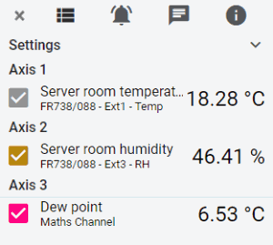 对于每个通道的测量单位不同的多通道记录应用程序,或者当通道测量范围两端的值时,添加额外的图形轴也是的。例如,同时测量超过 1000 °C 的炉内温度和环境温度需要两个轴,以便两者的细节可见。您一次最多可以查看四个具有不同范围的轴。
