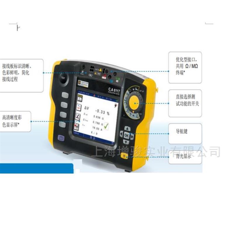 法国CA 6113多功能电气装置测试仪集所有电气测试功能于一身,同时测量接地电阻测量:打地桩式、回路阻抗,导通性测量(0.2A,绝缘电阻测量,RCD 测试:跳闸电流和时间,自动测试顺序,测量结果可存储,支持安卓应用生成报告,可充电电池供电。