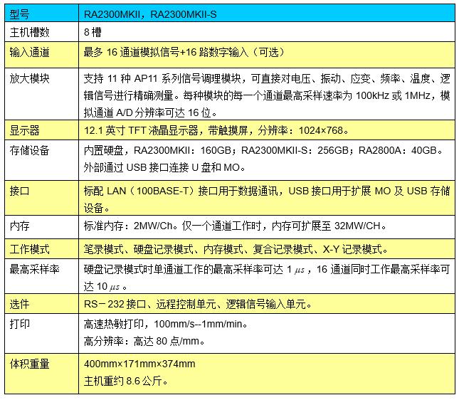 RA2300户操作简便,响应速度快,数据采集容易、数据彩色显示。高分辨率打印记录、一体化便携式组成。图形放大器设置和信号波形在高亮度的大彩色LCD屏上显示。全范围的插入式信号调理模块,实现硬盘记录(长时间将数据记录在60G的内置硬盘上)、内存记录(高速瞬时记录)、实时记录(象笔录的功能)多种测量模式。RA2300MK Ⅱ是一款理想的适用于维修、生产、质量、研发应用的设备.8槽: 最多16通道模拟信号或64通道逻辑信号输入,也可混合输入。选件:可选主机内置的16通道逻辑信号输入单元。